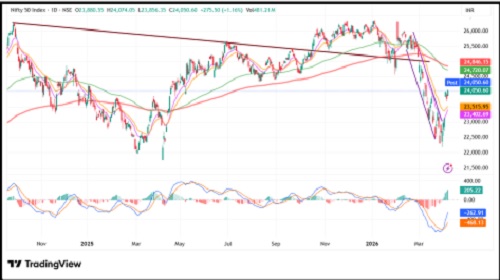 The index opened on a gap-up note and remained range-bound throughout the trading session, while sustaining well above the 24,000 level. The presence of significant put writing at this level indicates a bullish undertone in the market. On the daily scale, the index continues to hold above its key 20 DEMA, reinforcing the prevailing positive sentiment and indicating strength in the ongoing trend. On the sectoral front, Auto and Financial Services emerged as the top gainers, while the IT and CPSE indices underperformed during the session.