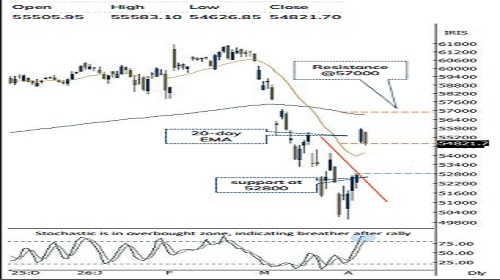 * Key highlight is over the past four session index has witnessed a sharp rally of 5800 points backed by deescalation in geopolitical conflicts which has pushed daily stochastic oscillator into overbought zone. Thereby couple of days breather at higher levels cannot be ruled out amid overbought conditions, that will eventually make market healthy and set the stage for the next leg of upmove towards 57000 levels being 200-day EMA.