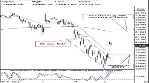 * Key highlight is over the past 4 session index has witnessed a sharp rally of 1800 points backed by de-escalation in geopolitical conflicts which has pushed daily stochastic oscillator into overbought zone. Thereby temporary breather at higher levels cannot be ruled out amid overbought conditions, that will eventually make market healthy and set the stage for the next leg of upmove towards 24800 in the coming weeks as it is confluence of 200 days EMA coincided with 61.8% retracement of Feb-April decline (26341- 22182).