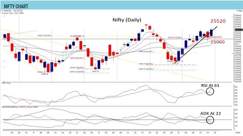 In yesterday’s session, the Nifty50 not only displayed a strong price trend but also closed above its previous day’s high, successfully surpassing the 25300 resistance on a closing basis. The index withstood recent volatility, slipping briefly towards its 20-DEMA support at 25060 before recovering to close above its 5-DEMA at 25210 for a second consecutive session — reviving bullish momentum. Despite intermittent dips, demand-driven buying continues to support the index. Both trend strength indicators remain comfortably in the buy zone, while the ADX near 25 signals improving momentum. A decisive move above 25200, particularly on rising volumes, could trigger short covering and open the path towards 25500. On the derivatives front, the options base has shifted higher from 24500 to 25000, reflecting stronger support, with resistance now seen at 25300, 25500, and a major congestion zone near 26000. A close above 25170 has reaffirmed the bullish momentum, and the follow-through breakout above 25300 reinforces the mediumterm uptrend. The strategy remains to buy on dips, with a momentum-based stop loss below 25060, targeting 25520–25680 in