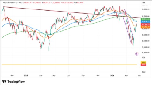 The index opened on a muted note but witnessed a strong recovery from the day’s low of 24,241, rallying to an intraday high of 24,480. However, it remained range-bound during the second half of the session. On the daily scale, the index continues to sustain well above its 50- DEMA, indicating underlying strength, though signs of exhaustion are emerging near the 24,400 zone. On the sectoral front, PSU Bank and Energy stocks were the top gainers, while Capital Market and IT emerged as the key underperformers for the day.