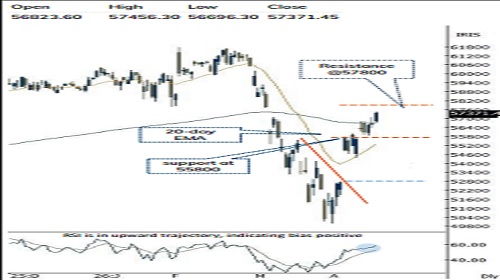• Key point to highlight is that Index has closed above its 200-day EMA for first time Since March 2026, indicating revival of upward momentum. Going ahead as Index has decisively close above 200-day EMA (57020). Hence, we believe index to resume its upward momentum and head towards 57800 in the coming weeks.