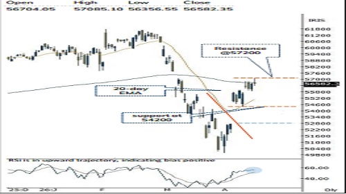* Key point to highlight is that Index has closed above its 50- day EMA for second time Since March 2026, indicating revival of upward momentum. Going ahead a decisive close above 200-day EMA (56700) will open the door for the next leg of up move towards 57200 in the coming weeks. Failing which could lead to a period of consolidation within 54900-56700 range.