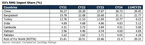 Countries such as Bangladesh, Turkey, Vietnam and Pakistan enjoy duty-free access to the EU market, while Cambodia benefits from zero tariff on certain high-value apparel. Following the Vietnam-EU FTA effective from August 01, 2020, Vietnam’s share in the EU’s RMG imports increased from 3.90% in CY20 to 4.84% in 11MCY25.
