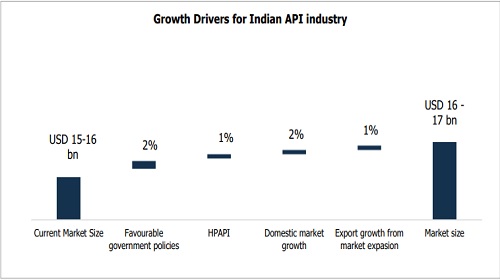 * The Indian Active Pharmaceutical Ingredient (API) market, currently valued at approximately USD 15-16 billion, is projected to grow at a CAGR of 5–7% in FY27 & FY28. The growth trajectory is supported by favourable government policies, a structural shift towards high-potency (HP API) and complex APIs, steadily rising domestic demand, and greater penetration into regulated and emerging markets.
