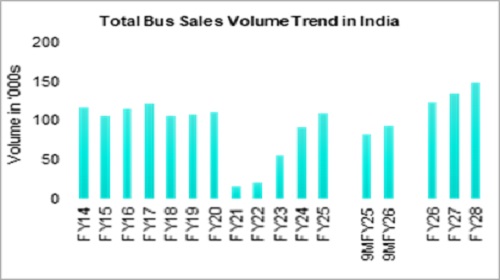Electric buses (E-buses) accounted for ~4% of India’s annual bus registrations in FY25 and 9MFY26 with 4,237 and 3,903 e-bus registrations, respectively. The segment grew ~16% in FY25 and ~31% YoY in 9MFY26 (on a low base), supported by central government incentives, enabling infrastructure, and the evolving Gross Cost Contract (GCC) framework. The broader bus industry is on track to surpass pre-COVID volumes by the end of FY26.