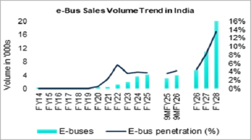 Currently, e-bus penetration in India remains low, but there has been a steady momentum over the past three years, reflecting greater policy thrust, cost economics, and execution depth. While early adoption was concentrated in a few large cities, deployments are now expanding into Tier II and Tier III markets. Government support through incentives, enabling charging infrastructure, and favourable GCC/standardised OPEX frameworks is expected to continue, strengthening operator confidence—especially as STUs increasingly tender capacity under these models. With an expanding ecosystem, annual e-bus sales are envisaged to reach around 20,000 units in FY28, increasing penetration to around 13%,” said Arti Roy, Associate Director, CareEdge Ratings.