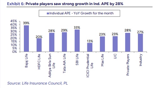 Private sector insurers—who have consistently outpaced their public sector counterpart in the Individual APE segment—demonstrated accelerated momentum in November. Within the coverage universe, SBI Life, Axis Max Life and HDFC Life emerged as the key performers, registering year-on-year growth of 32.7%, 22.6% and 19.7% respectively in Individual APE. ICICI Prudential Life reported a steady 13.1% rise, while other notable players such as Bajaj Allianz Life, Tata AIA Life and Aditya Birla Sun Life delivered impressive gains in the range of 28% to nearly 39% year-on-year. LIC, while traditionally dominant in other segments, also posted a healthy 22.9% growth in the category, underscoring the broad uptrend visible across the industry.