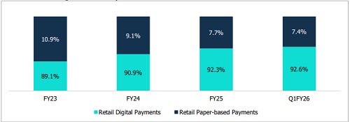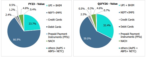 Digital payments, led by UPI, AePS, IMPS, and others, dominate retail transactions, accounting for 92.6% of payment value and 99.8% of transaction volume as of Q1 FY26. Cards and prepaid instruments are stable or in decline as UPI substitutes for low-value transactions. While UPI leads, other systems, such as NEFT, IMPS, and NACH, remain important, especially for high-value and bulk payments. NEFT remains crucial for mid-to-high-value transactions, with an average ticket size of approximately Rs 48,000 as of Q1FY26, which is significantly higher than that of UPI. IMPS continues to experience steady growth but is being cannibalised by UPI, which offers a similar instant payment experience with broader merchant acceptance. NACH transactions remain important for bulk disbursements, such as salaries, subsidies, and dividends.