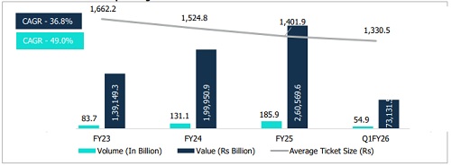 In a significant shift towards a more digitised financial landscape, retail digital payments in India have steadily increased their share to 92.6% in Q1FY26, up from 89.1% in FY23. The primary driver of this growth is UPI, which accounts for over 90% of the total credit payment volume, with 54.9 billion transactions recorded in Q1FY26. The decrease in the average transaction value to Rs 1,330 in Q1 FY26, from Rs 1,662 in FY23, demonstrates the increasing use of UPI for everyday micro-payments. The rapid adoption and deepening penetration of UPI are further evidenced by a 49% CAGR in transaction volume and a 36.8% CAGR in transaction value between FY23 and FY25.