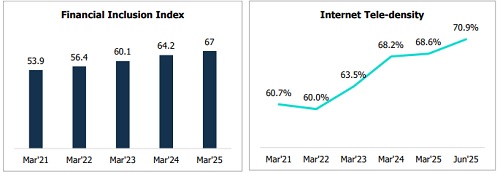 * Retail payments are now 99.8% digital, with paper-based instruments (Cheques) nearly obsolete, owing to policy push, infrastructure support, and deep fintech penetration. Rising internet penetration (from 60.7% in Mar’21 to 70.9% in June 2025 and expected at ~85% in 2028) and smartphone usage have accelerated this shift, enabling financial inclusion by bringing previously unbanked populations into the formal digital economy.