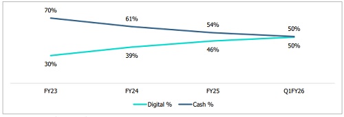 * Despite such huge growth in digital transactions, cash remains resilient. Cash usage in Private Final Consumption Expenditure (PFCE) is estimated to have reached a 50% share as of Q1FY26. While digital payments are likely to dominate in the coming years, the cash mode of payment will continue to coexist.