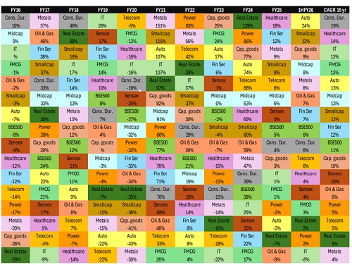 In 1HFY26, performance remained anchored infundamentals: Autos, Healthcare, Midcaps and selectivecyclicals led on earnings delivery, while smallcap gainswere more liquidity-driven. FMCG and IT improved butstayed mid-pack due to slower demand recovery andelevated valuations.Across 15 years, Consumer Durables, Healthcare, IT,FMCG and Financials remain the most consistentcompounders, while Metals, Power, Real Estate andsmallcaps continue to display boom–bust cyclicality.Overall, the market has transitioned from the broadliquidity-driven re-rating of FY21–22 to a moreearnings-anchored and capex-led regime, implyingcontinued dispersion ahead — with quality cyclicals andstrong midcaps better placed than valuation-stretchedsmallcaps.