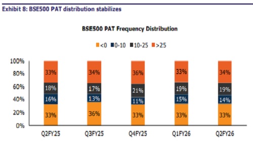 Overall trends remain mixed, with some positive trends. Nifty earnings growth remains anemic at ~9%, with some sequential improvement. Greenshoots are, however, stronger for the broader market, with the BSE-500’s PATg jumping to 17% YoY (vs 11% in Q1FY25). The frequency distribution for PATg in the BSE-500 keeps its barbell shape with little sequential change, with ~34% of the companies delivering +25% and 33% delivering negative growth.