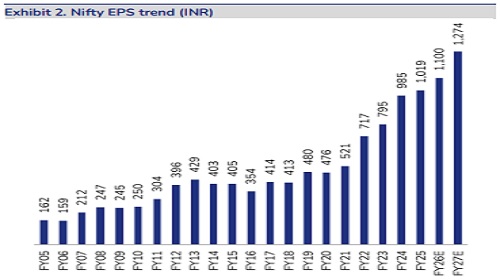 *EPS estimates increased for FY26E and FY27E: Following the 2QFY26 results, our Nifty50 EPS has been increased for FY26E and FY27E by 0.2% and 0.5% respectively. Consequently, our Nifty50 EPS growth for FY26E now stands at 7.9% (vs. 7.7% earlier), and for FY27E it stands at 15.9% (15.5% earlier). With this, the ask rate for the balance 6 months of FY26 stands at 7%.