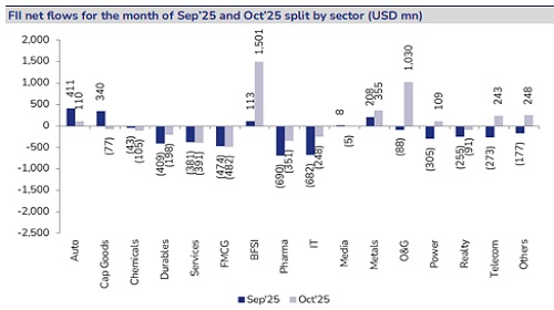 * FMCG, Services, Pharma, IT, Durables, Chemicals saw the largest FII outflows: Sectors that saw the highest outflows included FMCG (USD 482mn), Services (USD 391mn), Pharma (USD 351mn), IT (USD 248mn), Durables (USD 198mn) and Chemicals (USD 105mn). ? BFSI, O&G, Metals, Telecom, Auto, Power saw FII inflows: BFSI saw inflows of USD 1,501mn in Oct’25, followed by O&G at USD 1,030mn, Metals at USD 355mn, Telecom at USD 243mn, Auto at USD 110mn and Power at USD 109mn.
