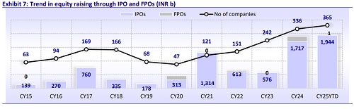 * During CY24-CY25YTD, the Indian primary market has recorded a fundraise of ~INR3.8t through 701 IPOs, compared to ~INR3.2t raised over CY19-23 via 629 IPOs.
