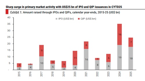 The continuous large supply of paper in India in the primary (see Exhibits 1-2) and secondary (see Exhibits 3-4) markets from private equity entities and promoters simply reflects high valuations across most sectors and stocks (see Exhibits 5-10). We expect the supply of paper to stay at high levels as long as (1) valuations remain high—owners have large incentive to monetize a part or even their entire shareholding in listed companies and (2) retail investors through DIIs continue to make ‘fantastic’ offers in the market through their price-agnostic purchases at all price points (see Exhibits 11-12).