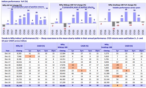 * Indian equity markets delivered yet another year of positive returns despite a highly volatile environment. In CY25, the Nifty 50 rose 11% YoY, while the Nifty Midcap-100 gained 6% YoY. In contrast, the Nifty Smallcap-100 declined 6% YoY.