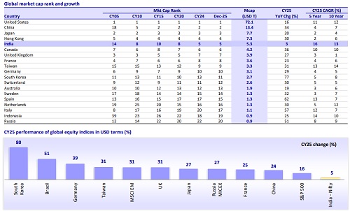 * While India outperformed most global markets on 5- and 10-year CAGR, it was the weakest among most global markets in CY25. Sharp INR depreciation further weighed on USD-denominated returns for Indian equities.