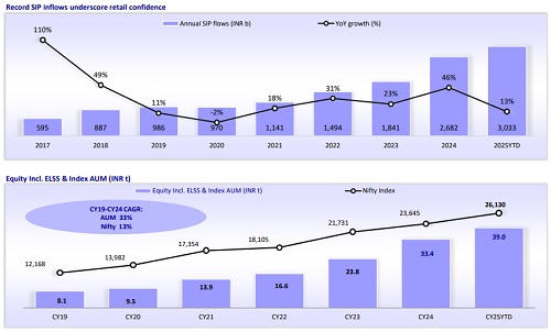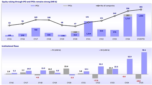 * Buoyant domestic participation drove DII inflows to a record high of USD90b, while total annual SIP flows rose 13% YoY to INR3t in CY25.