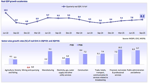* Despite the adverse impact of US tariffs on India’s manufacturing sector, domestic demand has so far managed to hold the strong growth trajectory. The GST cut-led pickup in consumption in 2Q and the rise in govt. spending in 3Q should provide the necessary boost to offset weak exports.