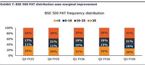 Despite the labor code hit, overall earnings remained robust. BSE-500 reported a 16% YoY PAT growth, with Energy (40%) and Discretionary (26%) the key drivers. Technology was the biggest laggard at 7% (all headline figures, including the labor code hit). Nifty earnings were much weaker at 8% (14% adjusted for the labor code hit). EBITDA margin for BSE-500 dropped by 35bps QoQ. However, topline growth touched double digits for the first time in the past 8 quarters, led by a sharp recovery in consumption. The PAT growth distribution was also robust – the share of companies delivering >25% PAT growth inched up slightly to 37% in Q3 from 35% in Q2, while the share of negative growth companies dropped sharply from 33% to 26%. Overall, we see strong signs of a consumption-led earnings growth recovery.
