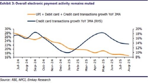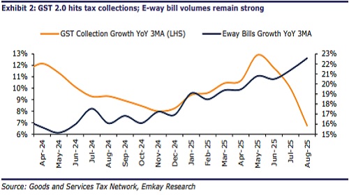 Concurrent indicators are not showing any sign of a growth revival yet. There were some silver linings in e-way bills and ports data, which though are likely to be front-ended pretariff shipments. We may see some noisy indicators in coming weeks, as growth stalled in Sep-26 due to the gap between the GST announcement and implementation on 22- Sep. Our channel checks indicate a strong revival in discretionary demand over the festival season in Q3FY26.