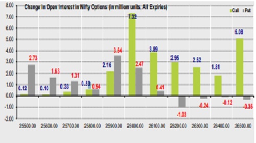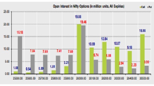 * Highest OI build-up is seen at 26000 strike Calls and 26000 strike Puts, to the tune of 19.88mn and 19.46mn respectively.