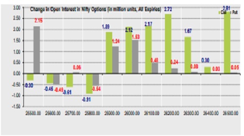 * Highest OI build-up is seen at 26000 strike Calls and 26000 strike Puts, to the tune of 20.84mn and 14.43mn respectively.