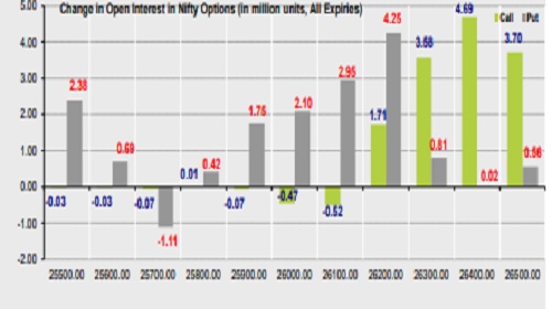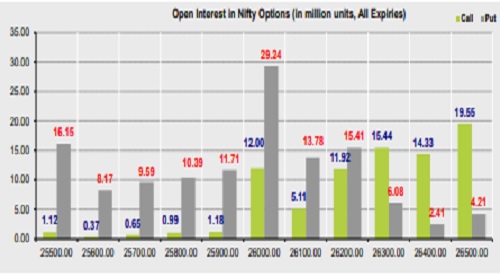 * Highest OI build-up is seen at 26500 strike Calls and 26000 strike Puts, to the tune of 19.55mn and 29.24mn respectively.