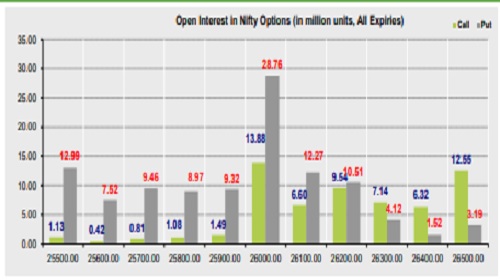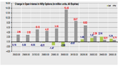 * Highest OI build-up is seen at 26000 strike Calls and 26000 strike Puts, to the tune of 13.88mn and 28.76mn respectively.