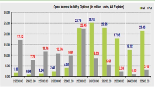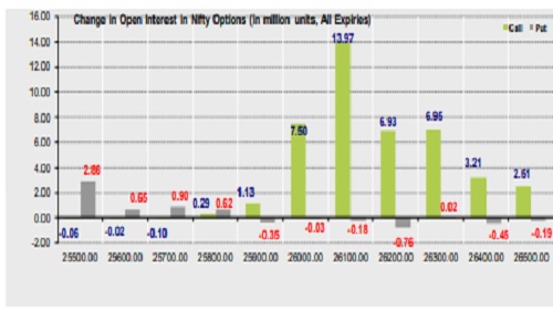 * Highest OI build-up is seen at 26100 strike Calls and 26000 strike Puts, to the tune of 25.18mn and 22.45mn respectively.