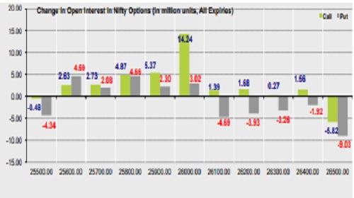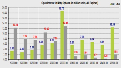 * Highest OI build-up is seen at 26000 strike Calls and 26000 strike Puts, to the tune of 18.72mn and 12.91mn respectively.