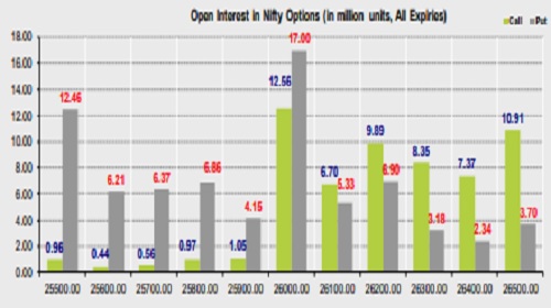 * Highest OI build-up is seen at 26000 strike Calls and 26000 strike Puts, to the tune of 12.56mn and 17mn respectively.
