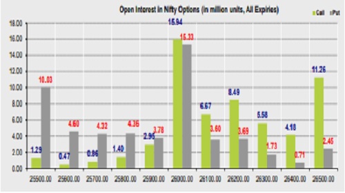 * Highest OI build-up is seen at 26000 strike Calls and 26000 strike Puts, to the tune of 15.94mn and 15.33mn respectively.