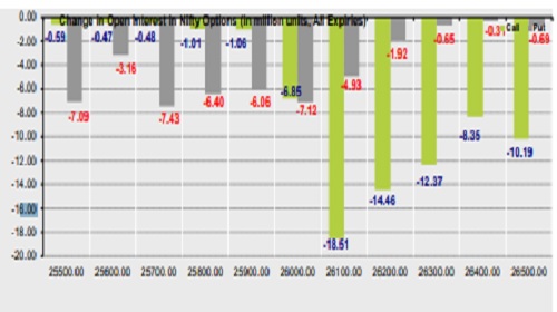 * The above second chart shows previous trading day’s change in Nifty options where Liquidations in OI were seen in 25900, 26000, 26100, 26200 strike Calls and at 25800, 25700, 25600, 25500 strike Puts indicating market is likely to remain range bound in the near term.