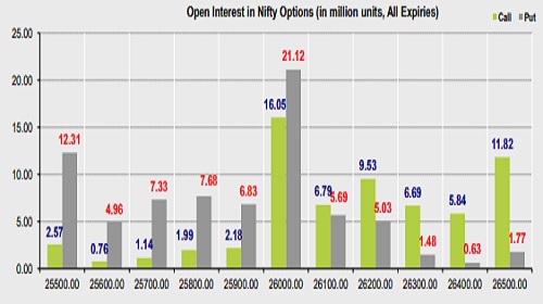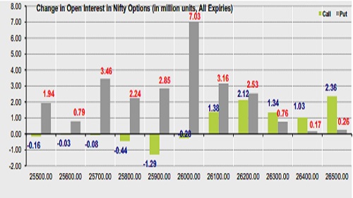 * Highest OI build-up is seen at 26000 strike Calls and 26000 strike Puts, to the tune of 16.05mm and 21.12mn respectively.