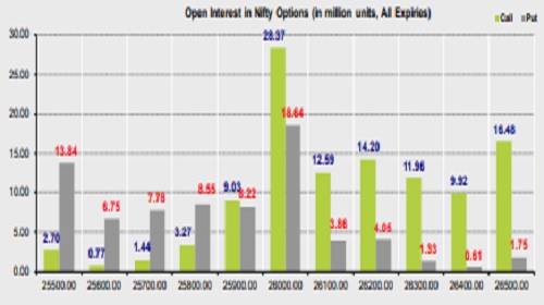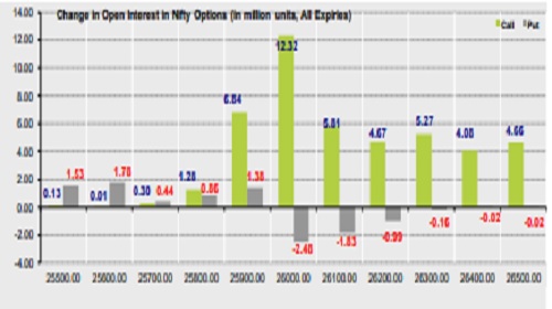 * Highest OI build-up is seen at 26000 strike Calls and 26000 strike Puts, to the tune of 28.37mm and 18.64mn respectively.