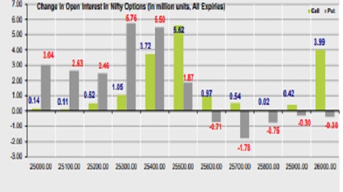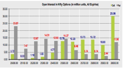 * Highest OI build-up is seen at 26000 strike Calls and 25000 strike Puts, to the tune of 29.96mn and 23.07mn respectively.