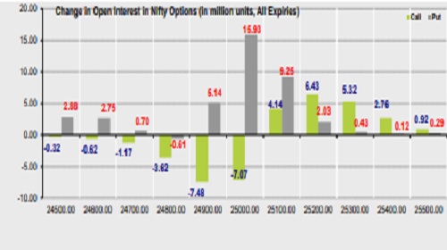 * The above second chart shows previous trading day’s change in Nifty options where Additions in OI were seen in 25400, 25300, 25200,25100 strike Calls and at 25000, 24900,24700,24600 strike Puts indicating market is likely to remain range bound in the near term.