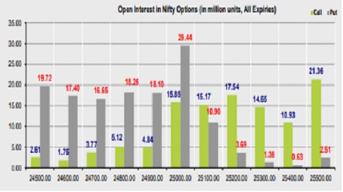 * Highest OI build-up is seen at 25500 strike Calls and 25000 strike Puts, to the tune of 21.36mm and 29.44mn respectively.