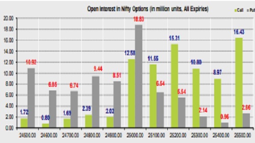 * Highest OI build-up is seen at 25500 strike Calls and 25000 strike Puts, to the tune of 16.43mm and 18.83mn respectively.
