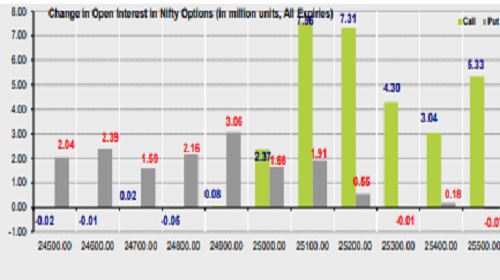 * The above second chart shows previous trading day’s change in Nifty options where Additions in OI were seen in 25400, 25300, 25200,25100 strike Calls and at 25000, 24900,24800,24700 strike Puts indicating market is likely to remain range bound in the near term.