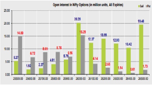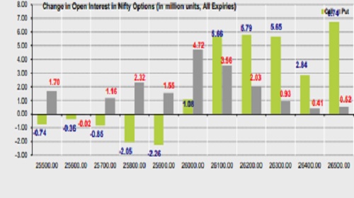 * Highest OI build-up is seen at 26000 strike Calls and 26000 strike Puts, to the tune of 20.20mm and 15.29mn respectively.