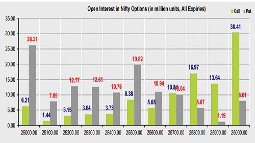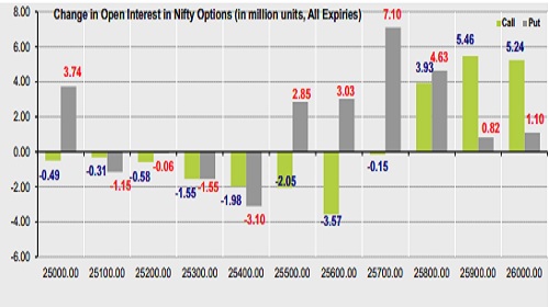 * Highest OI build-up is seen at 26000 strike Calls and 25000 strike Puts, to the tune of 30.41mm and 26.21mn respectively.