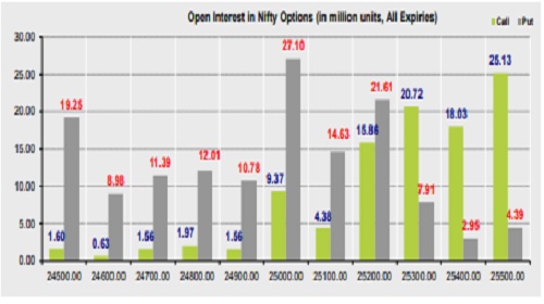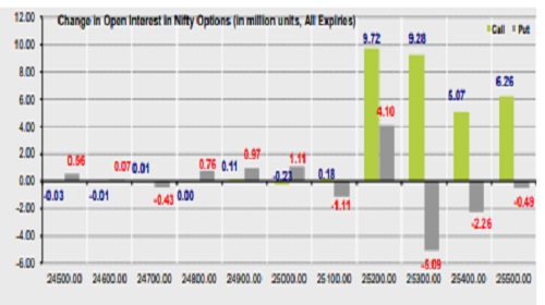 * The above second chart shows previous trading day’s change in Nifty options where Additions in OI were seen in 25500, 25400, 25300 strike Calls and at 24900, 25000, 25200 strike Puts indicating market is likely to remain range bound in the near term.