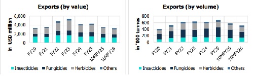 India continues to maintain a strong position in global agrochemical exports. Export volumes have expanded to nearly 0.7 million tonnes in FY25, reflecting sustained global reliance on Indian manufacturers. In FY26, export volumes stabilised, supported by steady demand in the United States and gradual recovery in select European and LATAM markets, even as some regions continued to adjust from previously elevated inventory levels. Entering FY27, export growth is expected to remain gradual and largely volume-led, supported by normalised channel inventories, stable global demand, and improving traction in key export regions. However, pricing pressures are likely to persist amid continued global oversupply. The export mix reflects a balance between scale and value. Fungicides contribute significantly to volumes, supporting capacity utilisation, while herbicides and insecticides generate relatively higher value per unit. This balanced product mix supports operating efficiency and earnings stability, particularly during periods of pricing pressure.