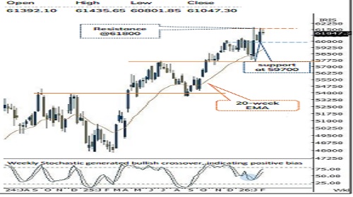 * Volatility is likely to remain elevated because of geopolitical uncertainty, therefore any corrective declines from current levels should be viewed as buying opportunities as strong demand zone is identified near 59,700, being 50-day EMA and 61.8% retracement of the current up move (57,783-61,674).