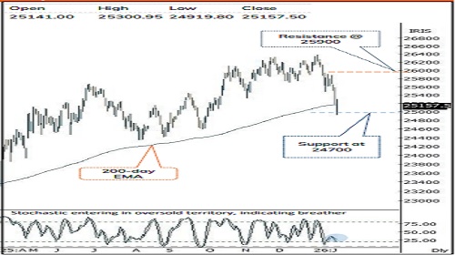 * The index opened the day on a negative note and accelerated its decline below previous day’s low; however supportive efforts emerged from lower levels and closed near its 200-day EMA(25,124). As a result, the daily price action formed a Doji candle in the vicinity of 200-day EMA, reflecting potential exhaustion of selling pressure. A decisive move above the previous session’s high would signal a pause in prevailing downward momentum and could trigger for technical pullback towards 25,600 zone